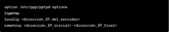Reemplaza <dirección_IP_del_servidor> con la dirección IP estática del servidor y <dirección_IP_inicial>-<dirección_IP_final> con un rango de direcciones IP que se asignarán a los clientes de la VPN.